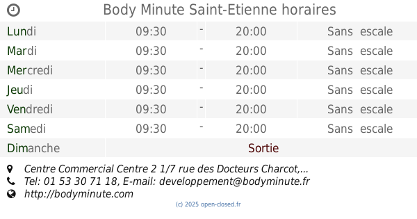 It is also possible to : Modifier ces HEURES D'OUVERTURE of Store Body Minute Dans Saint-Etienne, Centre Commercial Centre 2 1/7 rue des Docteurs Charcot,